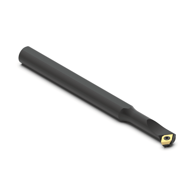 This steel boring bar with metric dimensions has a shank diameter of 0.394” (10.00 mm) and a functional length of 4.331” (110.00 mm). It has no cooling channel. The tool cutting edge angle is 52.5° and the maximum boring depth at the minimum bore diameter of 0.433” (11.00 mm) is 1.024” (26.00 mm).