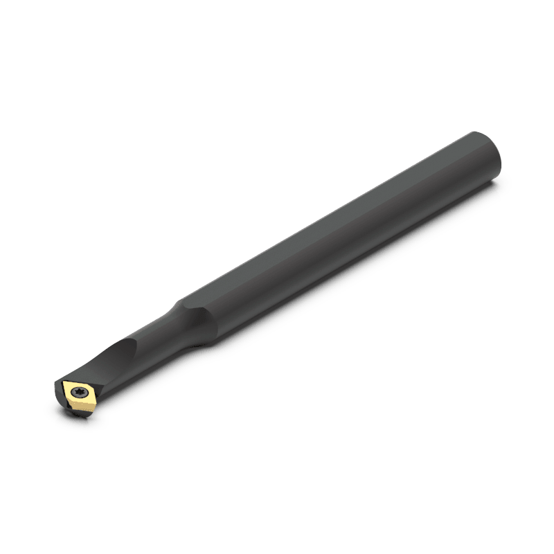 This steel boring bar with metric dimensions has a shank diameter of 0.394” (10.00 mm) and a functional length of 4.331” (110.00 mm). It has no cooling channel. The tool cutting edge angle is 52.5° and the maximum boring depth at the minimum bore diameter of 0.433” (11.00 mm) is 1.024” (26.00 mm).